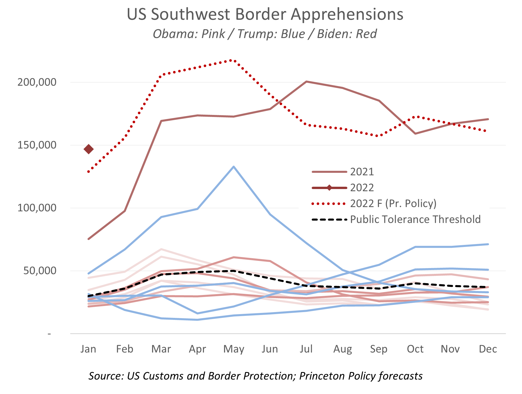 Notwithstanding the decline in absolute numbers, January apprehensions were still running well ahead of our forecast, in fact 18,000 (+14%) above our forecast of 129,000. Illegal immigration shows a distinct seasonality, with January historically the softest month. Therefore, although apprehensions declined in absolute terms, they came in quite hot compared to expectations. We should not read too much into January numbers, but there is no reason to believe that border control has fundamentally improved this past month.