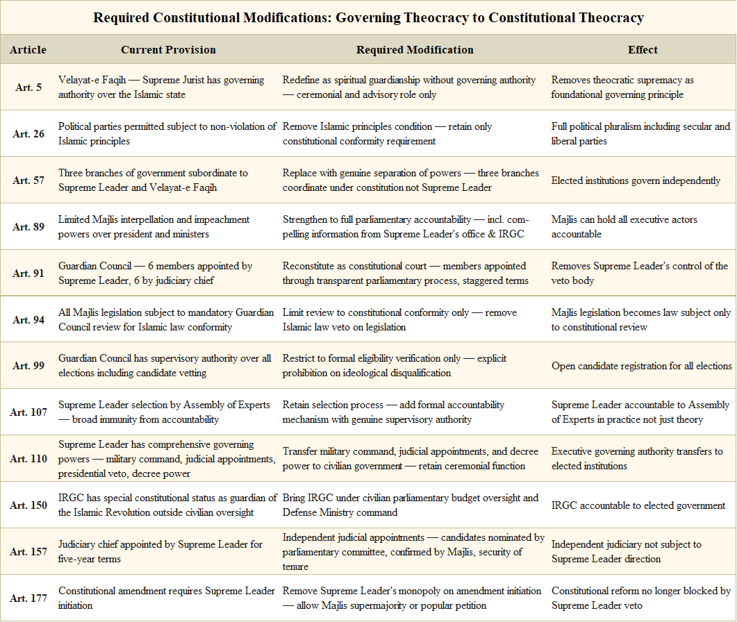 A democratic Iran does not require a new constitution. It requires specific modifications to the existing one. Twelve articles stand between the Iran that exists and the Iran that is possible. If passed by a Majlis supermajority, these 12 amendments would convert Iran from a theocratic dictatorship into a constitutional theocracy — a system with historical precedent, theological grounding in Shia jurisprudence, and genuine democratic substance. The resulting constitutional structure follows established international precedent: